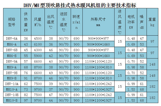 DHV型機(jī)組為循環(huán)空氣暖風(fēng)機(jī)組,MH型機(jī)組為新風(fēng)/循環(huán)空氣暖風(fēng)機(jī)組。