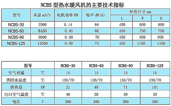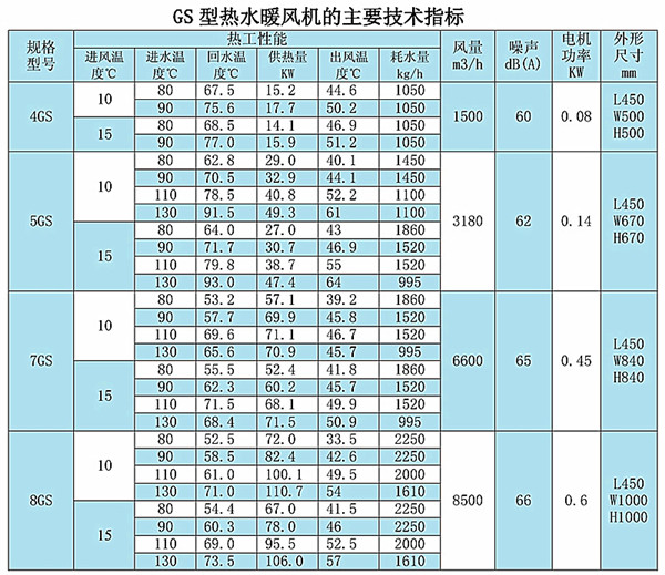 艾爾格霖熱水暖風機共分為GS型高溫熱水暖風機、TS中溫熱水暖風機、NCB型熱水暖風機三種類型,其技術參數(shù)如下