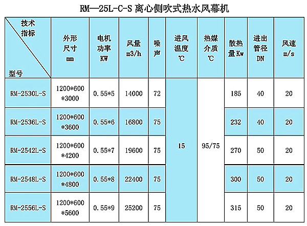 RM25-L-C-S(Q)離心側(cè)吹式風(fēng)幕機(jī)可以以熱水或蒸汽為熱媒,是外形尺寸大、阻斷效果好的裝配式機(jī)型。該機(jī)型適合安裝在高度3米以上,寬度6米以內(nèi)的門洞側(cè)面。適用于大型的倉庫、廠房的高大門洞使用,正常選擇雙側(cè)吹風(fēng)方式,門洞寬度小于2.5米時可以選用單側(cè)吹風(fēng)。
