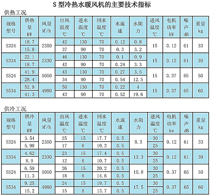 2.S型冷熱水暖風機,當熱媒與冷媒共用熱交換器時,熱水溫度不宜高于65℃,冷媒宜采用供水溫度為6-15℃的冷水,若熱水溫度高于65℃,則應由防止結垢的有效措施,以供冷時的熱交換效果。