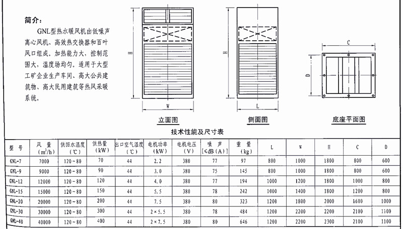 GNL型熱水暖風(fēng)機(jī)由低噪聲離心風(fēng)機(jī),高效熱交換器和百葉風(fēng)口組成,加熱能力大,控制方位大,溫度場均勻,適用于大型工礦企業(yè)生產(chǎn)車間,高大公共建筑物、高大民用建筑等熱風(fēng)采暖系統(tǒng)。