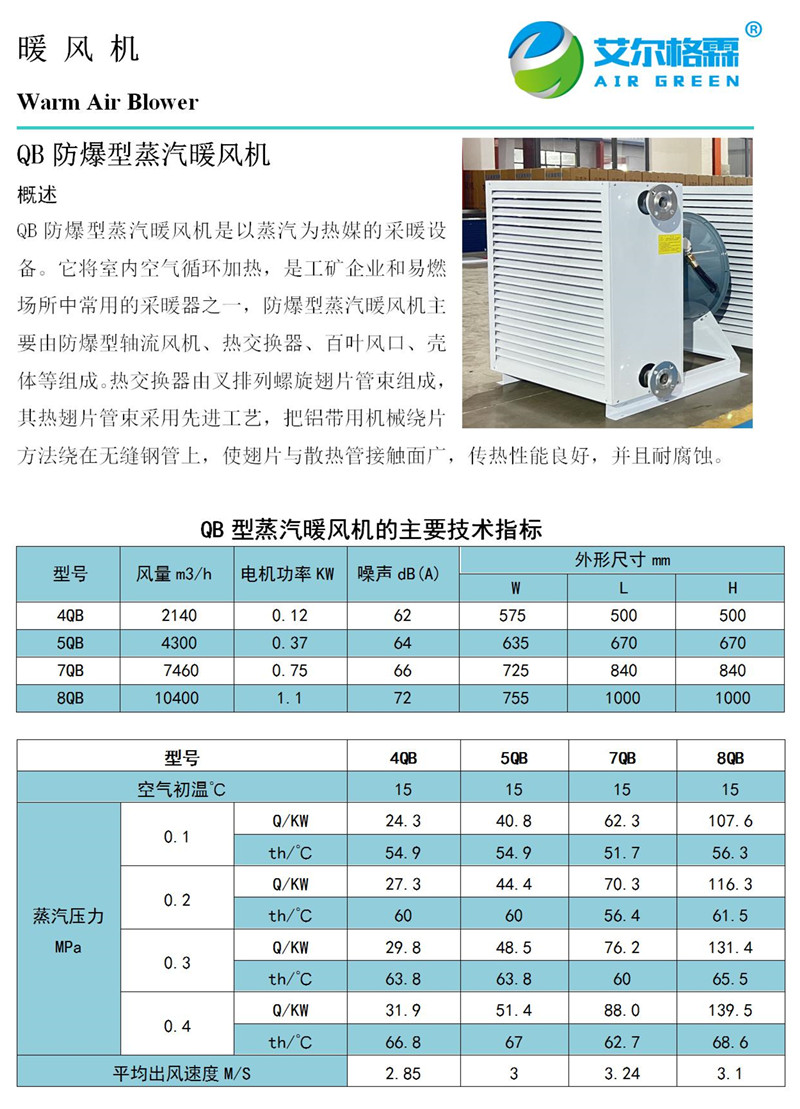 Q-B防爆型蒸汽暖風(fēng)機是在普通型蒸汽暖風(fēng)機基礎(chǔ)上的延伸產(chǎn)品。采用BT35-11防爆型軸流風(fēng)機,適合煤礦、化工等特殊行業(yè)。